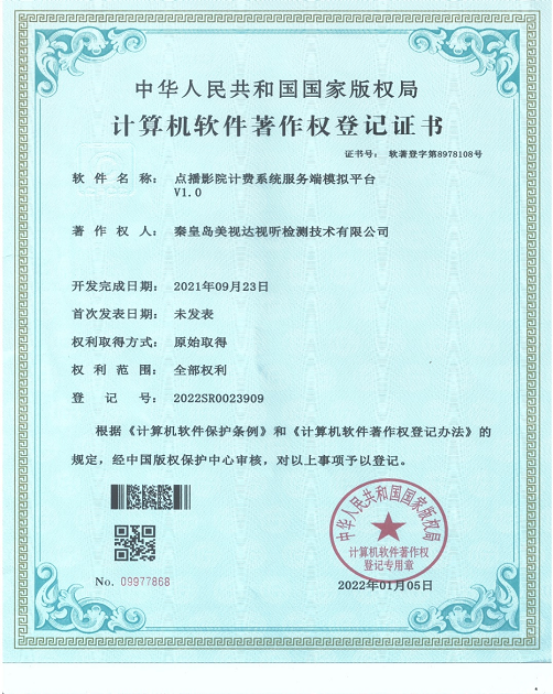2022年1月5日,美視達(dá)公司自主開(kāi)發(fā)并實(shí)施應(yīng)用的點(diǎn)播影院計(jì)費(fèi)系統(tǒng)服務(wù)端模擬平臺(tái),獲得國(guó)家版權(quán)局計(jì)算機(jī)軟件著作權(quán)授權(quán),軟件名稱(chēng):“點(diǎn)播影院計(jì)費(fèi)系統(tǒng)服務(wù)端模擬平臺(tái)V1.0”,證書(shū)號(hào):軟著登字第8978108號(hào)。